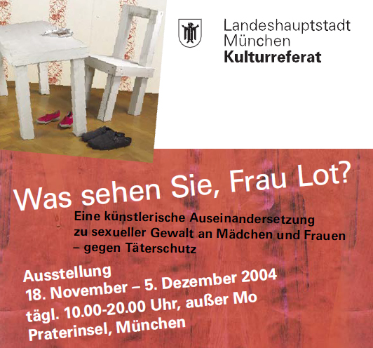 2004: Was sehen Sie, Frau Lot?:Eine künstlerische Auseinandersetzung zu sexueller Gewalt an Mädchen und Frauen - gegen Täterschutz, die das Kulturreferat auf Empfehlung des Bündnisses nach München geholt hat. Ein umfangreiches Begleitprogramm, sowie die fachliche Präsenz wurde vom Münchner Bündnis 'Aktiv gegen Männergewalt realisiert.In Kooperation mit dem Kulturreferat der Landeshauptstadt München. ![]()